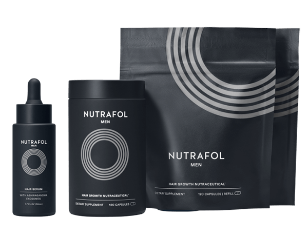 A complete regimen that targets root causes of thinning for visibly fuller hair and scalp coverage. Includes a 3-month supply of Nutrafol Men (1 bottle & 2 refill pouches) and 1 bottle of Nutrafol Hair Serum for Men.