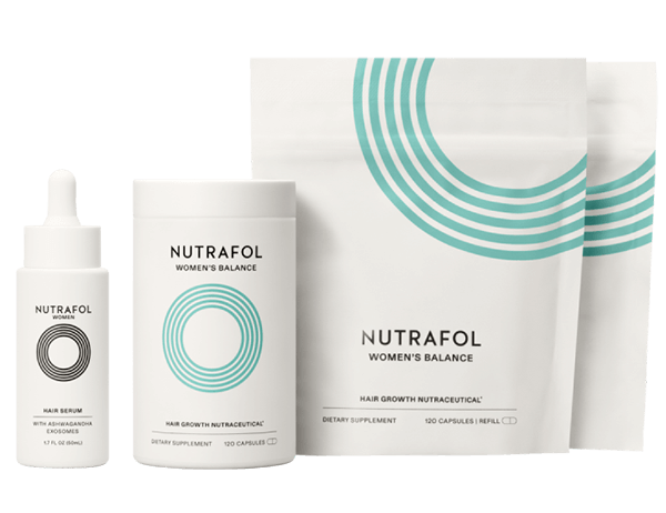 A complete regimen for visibly thicker hair volume and fuller scalp coverage through and beyond menopause. Targets root causes of thinning with a 3-month supply of Nutrafol Women’s Balance Hair Growth Nutraceuticals (1 bottle & 2 refill pouches) and 1 bottle of Hair Serum for Women.